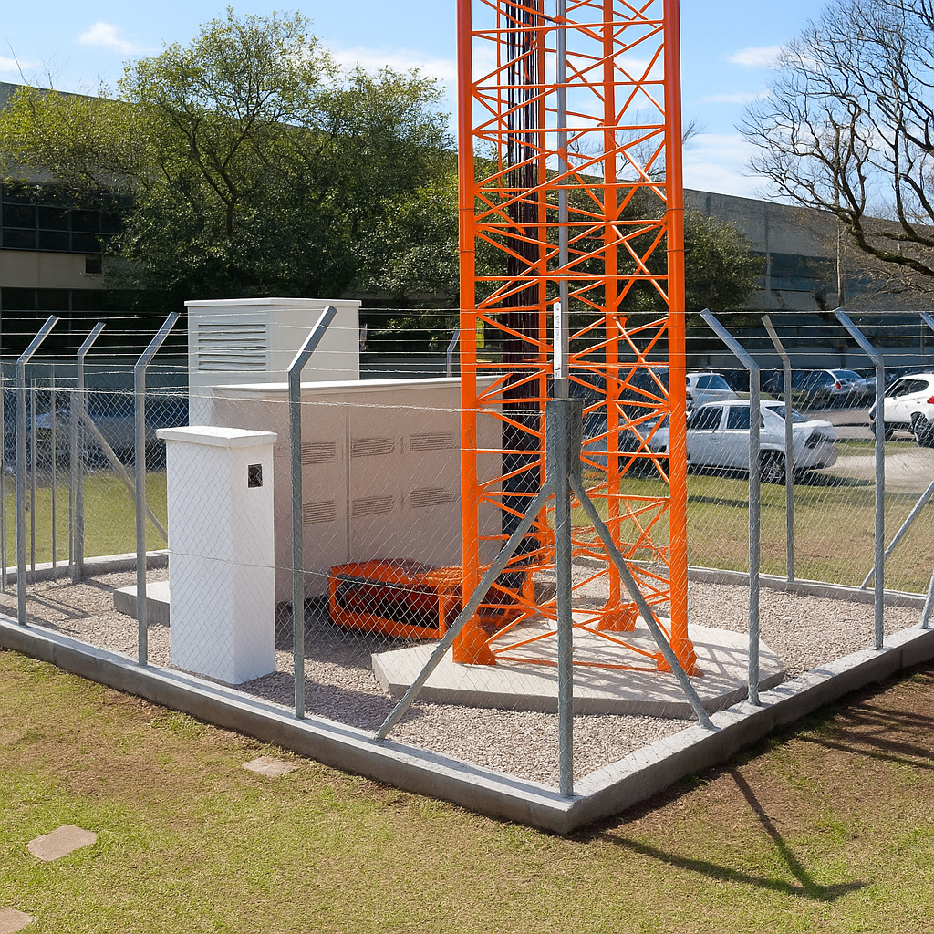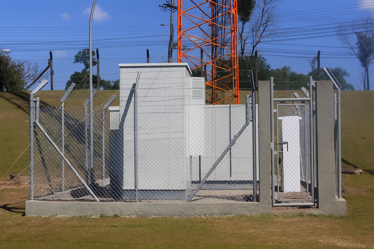 Inclui também os demais itens de infra-estrutura necessários como entrada de energia, aterramento, torre autoportante e abrigo metálico.